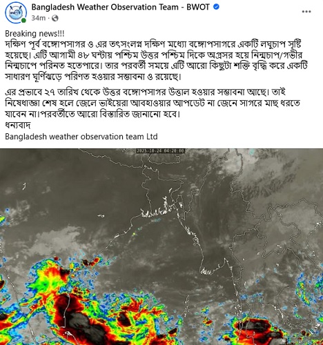 দক্ষিণ-পূর্ব বঙ্গোপসাগর ও এর তৎসংলগ্ন দক্ষিণ-মধ্য বঙ্গোপসাগরে একটি লঘুচাপ সৃষ্টি হয়েছে। আবহাওয়া অফিস জানিয়েছে, এটি আগামী ৪৮ ঘণ্টার মধ্যে পশ্চিম-উত্তর-পশ্চিম দিকে অগ্রসর হয়ে নিম্নচাপ বা গভীর নিম্নচাপে পরিণত হতে পারে।
