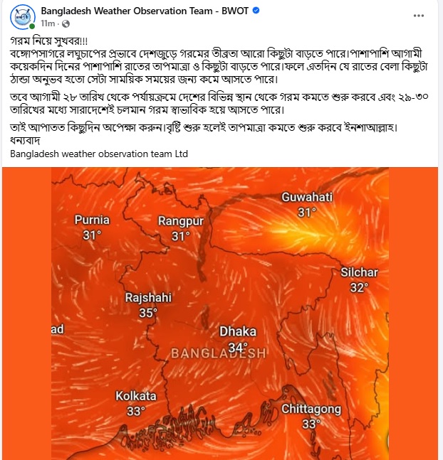 অবজারভেশন থেকে আরও জানানো হয়, বঙ্গোপসাগরে লঘুচাপের কারণে বাতাসে আর্দ্রতার পরিমাণ বেড়ে গেছে, যা গরমের অস্বস্তি আরও বাড়িয়েছে। তবে লঘুচাপটি দুর্বল হয়ে পড়লে এবং বৃষ্টি শুরু হলে তাপমাত্রা দ্রুত কমে আসবে বলে আশা করা হচ্ছে।