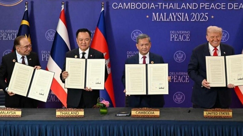 মার্কিন প্রেসিডেন্ট ডোনাল্ড ট্রাম্পের মধ্যস্থতায় শান্তি চুক্তি সই করেছে থাইল্যান্ড ও কম্বোডিয়া। রোববার মালয়েশিয়ায় আসিয়ান শীর্ষ সম্মেলনের ফাঁকে এই চুক্তিতে স্বাক্ষর করেন থাইল্যান্ডের প্রধানমন্ত্রী অনুতিন চার্নভিরাকুল ও কম্বোডিয়ার প্রধানমন্ত্রী হুন মানেত। এই চুক্তি স্বাক্ষর অনুষ্ঠানে সভাপতিত্ব করেন ট্রাম্প। খবর বিবিসির।