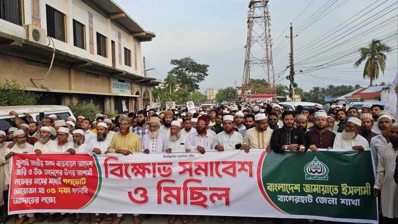 সমাবেশে বক্তারা বলেন,আমরা ন্যায্য দাবি নিয়ে রাজপথে নেমেছি। সরকারের দায়িত্ব হলো জনগণের কথা শোনা, না হলে জনগণ রাস্তায় নামবে। নির্বাচনে সবার জন্য সমান সুযোগ না দিলে শান্তিপূর্ণ রাজনৈতিক পরিবেশ সম্ভব নয়। অন্যদিকে, একটি দফা তাদের জেলা কার্যালয়ের অফিসের সামনে খেলাফত মজলিস বাগেরহাট জেলা শাখা বিক্ষোভ সমাবেশ করে। সমাবেশে সংগঠনের জেলা সেক্রেটারি ড. মো. ফরিদ উদ্দিন বলেন, আমরা স্পষ্ট জানিয়ে দিচ্ছি—দাবি আদায় না হলে আমরা কোনো নির্বাচনে অংশ নেব না। দেশজুড়ে যে অন্যায়, দমননীতি ও গণহত্যা চলছে, তার বিচার না হলে জনগণ রাস্তায়ই রায় দেবে। তিনি আরও বলেন,আগস্টের হত্যাযজ্ঞের বিচার এখনো হয়নি। যারা এই অন্যায়ের দায়ী, তাদের বিচারের আওতায় আনতে হবে। ইসলাম ও জনগণের অধিকার রক্ষার লড়াই আমরা চালিয়ে যাব। ইসলামী দলগুলো ৫টি দফা হলো, অবিলম্বে জুলাই জাতীয় সনদ ও এর আইনি ভিত্তি প্রদান। সংসদের উচ্চকক্ষে পিয়ার পদ্ধতিতে নির্বাচন। আওয়ামী ফ্যাসিবাদ ও দোসরদের অপরাধের বিচার দৃশ্যমান করা। আওয়ামী ফ্যাসিবাদের দোসরদের রাজনৈতিক কর্মকাণ্ড স্থগিত। নির্বাচনের সবার জন্য সমান সুযোগ (লেভেল প্লেয়িং ফিল্ড) তৈরি। সকল প্রাথমিক বিদ্যালয়ে ধর্মীয় শিক্ষক নিয়োগ।