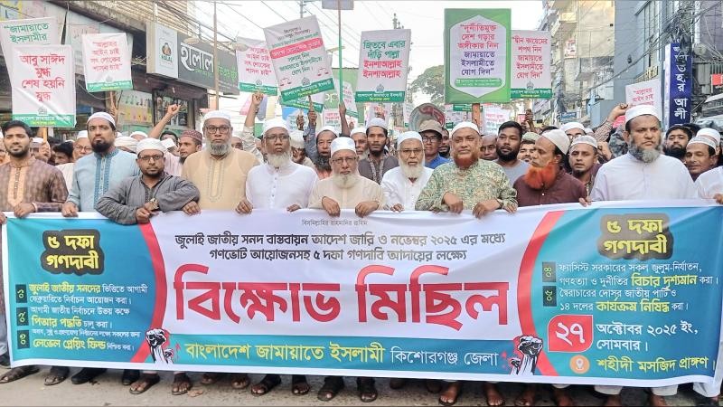 জুলাই সনদের ভিত্তিতে নির্বাচন, সংসদের উভয় কক্ষে পিআর (সংখ্যানুপাতিক) পদ্ধতি চালুসহ পাঁচ দফা দাবিতে কিশোরগঞ্জে জামায়াতে ইসলামী ও ইসলামী আন্দোলন বিক্ষোভ মিছিল করেছে।