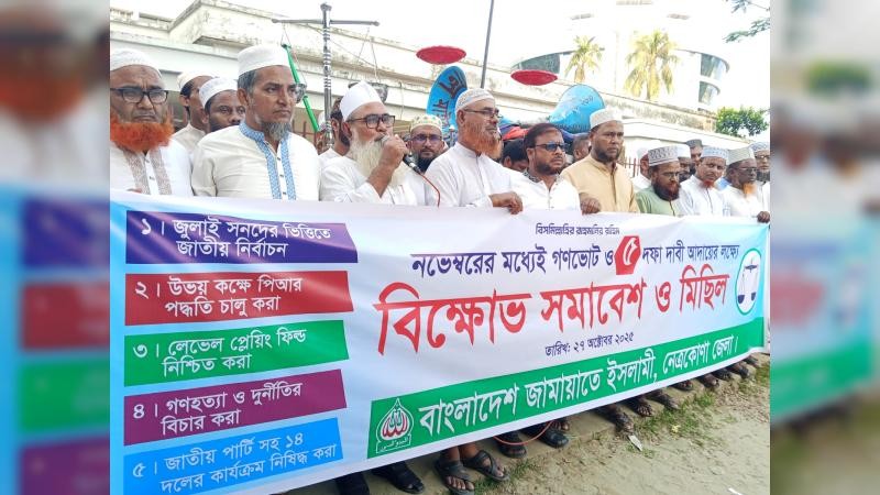 ক্তারা বলেন, নভেম্বরের মধ্যেই গণ ভোট দিতে হবে। জুলাই সনদের আইনে ভিত্তি দিয়ে একটি অংশগ্রহণমূলক নির্বাচনের ব্যবস্থা করতে হবে। প্রধান অতিথি তার বক্তব্যে বলেন, কোন কোন জায়গায় একটি দল আমাদের নেতা কর্মীদের ওপর আক্রমণ করছে। আমরা বলতে চাই, এটি বন্ধ করুন। আওয়ামী লীগের মত ফ্যাসিস্ট হইয়েন না। তাহলে জনগণ আপনাদের সাথেও আওয়ামী লীগের মতোই আচরণ করবে। জেলা জামায়াতের আমির সভাপতির বক্তব্যে বলেন, দেশের মানুষ যেনতেন কোন নির্বাচন মেনে নিবে না। প্রশাসনকে বলবো নিরপেক্ষ আচরণ করুন। কোন দলের প্রতি আনুগত্য দেখাবেন না। এরপর মিছিলটি শহরের প্রধান প্রধান সড়ক প্রদক্ষিণ করে নেত্রকোনা কেন্দ্রীয় মসজিদের সামনে এসে শেষ হয়।মিছিলে জামায়াতের ২ হাজারেরও বেশি নেতাকর্মী অংশগ্রহণ করেন।