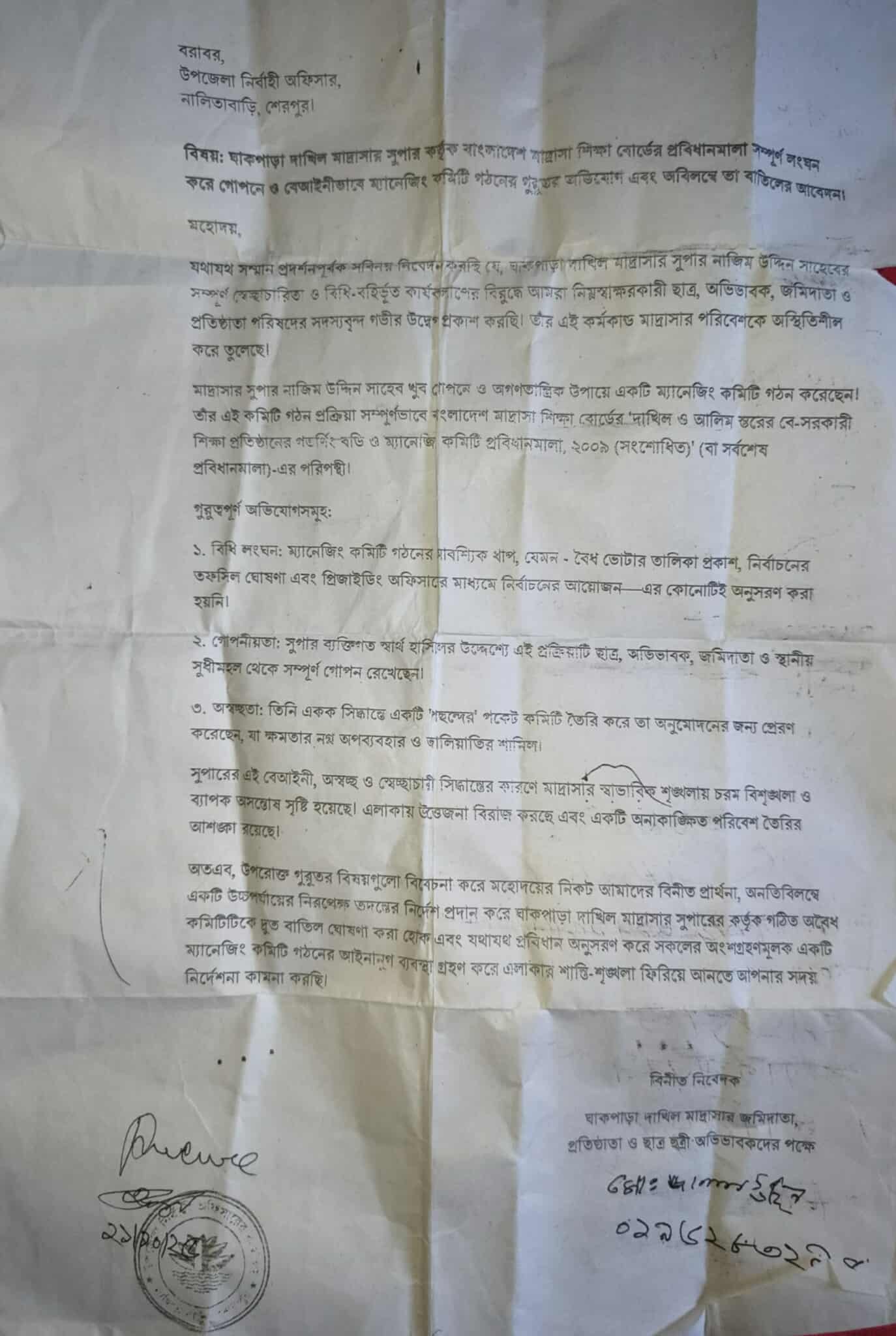 শেরপুরের নালিতাবাড়ী উপজেলার ঘাকপাড়া দাখিল মাদরাসায় গোপনে ম্যানেজিং কমিটি গঠন করার অভিযোগ উঠেছে। অভিভাবকদের না জানিয়ে এমন কমিটি গঠন কয়ায় ক্ষুব্ধ হয়েছেন শিক্ষার্থী অভিভাবক ও এলাকাবাসী।