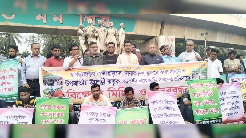 তিনি আরও বলেন, পার্বত্য চট্টগ্রামে দু’ধরণের ভূমি মালিকানার চর্চা করে আসছে উপজাতিরা। ক) প্রথাগত মালিকানা, খ) প্রচলিত আইন স্বীকৃত মালিকানা। বর্তমান আধুনিক যুগে প্রথাগত মালিকানা কোনোরূপ ভাবেই স্বীকৃত নয়, যা ১৯০০ শাসন বিধিতেও কোনো ভাবে স্বীকৃত বলে প্রমাণিত হয়না। ১৮৭০ সালে পার্বত্য চট্টগ্রামের এক চর্তুথাংশ এলাকায় সংরক্ষিত বনাঞ্চল ছিলো ।সেই বনাঞ্চল এখন দখলে নিয়েছে উপজাতীয় সন্ত্রাসীগোষ্ঠীরা।রাষ্ট্রীয় খাস জমি এবং সংরক্ষিত বনাঞ্চল নিজেদের দখলে নিয়েছে তারা। তারই ধারাবাহিকতায় গত ২৪ অক্টোবর খাগড়াছড়ি জেলার লক্ষ্মীছড়ি উপজেলার বারমাছড়ি ইউনিয়নে ঝুকিপূর্ণ এলাকায় সেনাবাহিনীর নিরাপত্তা ক্যাম্প স্থাপন করতে গেলে সন্ত্রাসীরা বাঁধা প্রদান করে ।রাস্তায় গাছ কেটে সেনাবাহিনীর চলাচলের গতিরোধ করে। উগ্রপন্থী সশস্ত্র সংগঠনের নারী নেত্রীদের এনে দেশপ্রেমিক সেনাবাহিনীর সম্মুখে দাঁড় করিয়ে দেয়। সেনাক্যাম্প নির্মাণের জন্য নির্ধারিত ভূমিতে রাতের আঁধারে বৌদ্ধ মূর্তি স্থাপন করে ধর্মের দোহাই দিয়ে বড় ধরনের ইসুতে রূপান্তরিত করার চেষ্টা চালাচ্ছে। এতে স্পষ্ট হয়ে যে পার্বত্য চট্টগ্রামে দেশদ্রোহী গোষ্ঠীগুলো ধর্মকে হাতিয়ার হিসেবে ব্যবহার করছে নারীদের বানিয়েছে তাদের ঢাল। আমরা এর তীব্র নিন্দা ও প্রতিবাদ জানাচ্ছি ।