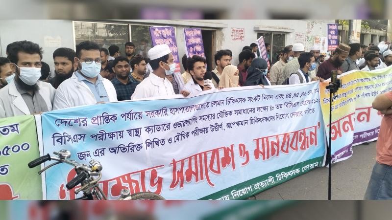 দেশের প্রান্তিক পর্যায়ে সরকারি হাসপাতালগুলোতে চলমান চিকিৎসক সংকট নিরসন এবং ৪৪, ৪৫, ৪৬, ৪৭ তম বিসিএস পরীক্ষায় স্বাস্থ্য ক্যাডারের ওভারলিপিং নিরোসনে ৪৮ তম বিসিএস থেকে ৩১২০ জন এর অতিরিক্ত লিখিত ও মৌখিক পরীক্ষায় উত্তীর্ণ অপেক্ষমান চিকিৎসকদের নিয়োগ দেওয়ার দাবিতে রাজধানী ঢাকার জাতীয় প্রেস ক্লাবের সামনে বিক্ষোভ ও মানববন্ধন কর্মসূচি পালন করে ৪৮তম বিসিএস নিয়োগপ্রত্যাশী সাধারণ চিকিৎসক ফোরাম। দুপুরের পর রাস্তা ব্লক করে দেয় পরীক্ষায় উত্তীর্ণ অপেক্ষমান চিকিৎসকরা।