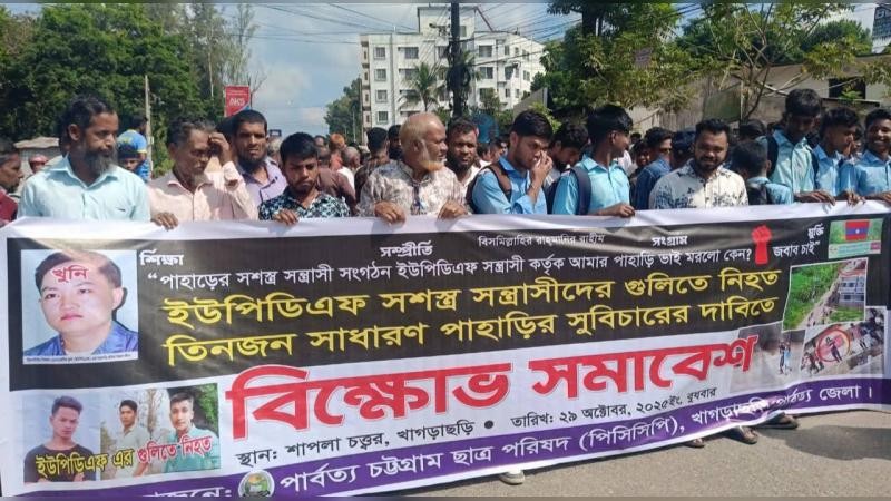 ইউপিডিএফের সশস্ত্র সন্ত্রাসীদের গুলিতে নিহত তিনজন সাধারণ পাহাড়ি যুবক হত্যার সুবিচারের দাবিতে বিক্ষোভ মিছিল ও সমাবেশ করেছে পার্বত্য চট্টগ্রাম নাগরিক পরিষদ খাগড়াছড়ি জেলা শাখা।