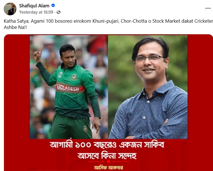 সম্প্রতি প্রধান উপদেষ্টার প্রেস সচিব শফিকুল আলম সাকিবকে নিয়ে মন্তব্য করেন যে, তার মতো ‘অপরাধী’ ক্রিকেটার ১০০ বছরেও আর জন্মাবে না।