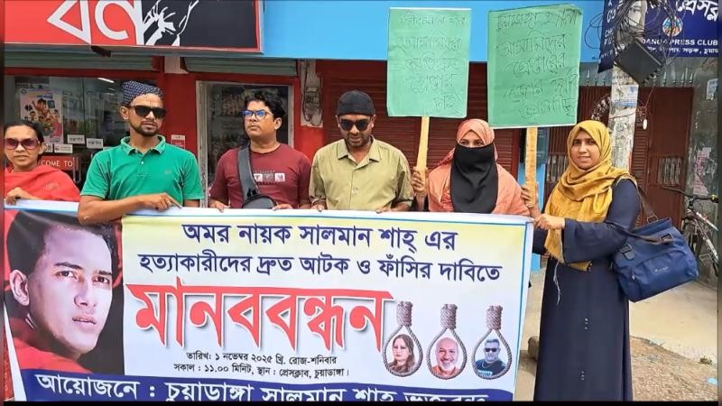 চিত্রনায়ক সালমান শাহ’র হত্যাকারীদের দ্রুত গ্রেপ্তার ও ফাঁসির দাবিতে চুয়াডাঙ্গায় মানববন্ধন কর্মসূচি পালিত হয়েছে। শনিবার বেলা ১১ টায় চুয়াডাঙ্গা প্রেসক্লাবের সামনে এ মানববন্ধন অনুষ্ঠিত হয়।