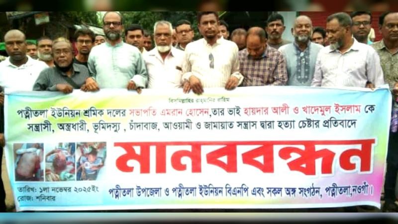 নওগাঁর পত্নীতলায় ইউনিয়ন শ্রমিক দলের সভাপতি এমরান হোসেন, তার ভাই হায়দার আলী ও খাদেমুল ইসলাম কে সন্ত্রাসী, অস্ত্রধারী, ভূমিদস্যু, চাঁদাবাজ, আওয়ামী ও জামায়াত সন্ত্রাস দ্বারা হামলা ও হত্যা চেষ্টার প্রতিবাদে উপজেলা ও পত্নীতলা ইউনিয়ন বিএনপি এবং সকল অঙ্গ সংগঠনের নেতাকর্মীদের অংশগ্রহনে শনিবার (১ নভেম্বর) উপজেলার কাটাবাড়ি বাজার এলাকায় এক মানববন্ধন কর্মসূচি পালিত হয়েছে।
