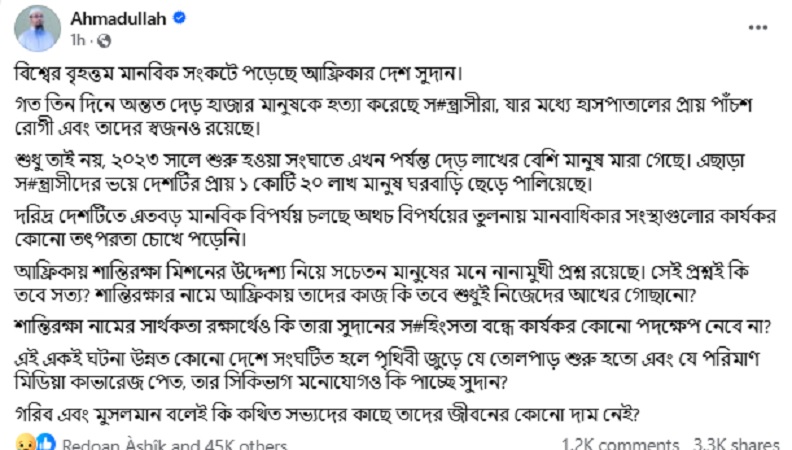 আফ্রিকার দেশ সুদানে গণহত্যা নিয়ে ফেসবুকে একটি পোস্ট করেছেন জনপ্রিয় ইসলামি বক্তা ও আস-সুন্নাহ ফাউন্ডেশনের চেয়ারম্যান শায়খ আহমাদুল্লাহ।