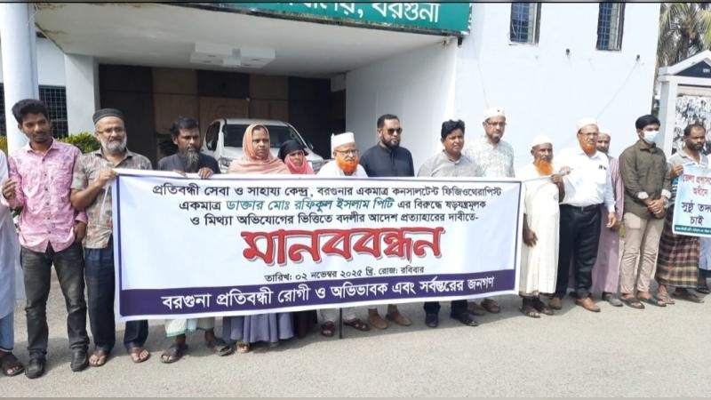 প্রতিবন্ধী সেবা ও সাহায্য কেন্দ্র, বরগুনার কনসালটেন্ট ফিজিও থেরাপিষ্ট ডাক্তার মোঃ রফিকুল ইসলামের বিরুদ্ধে ষড়যন্ত্রমূলক মিথ্যা অভিযোগ প্রত্যাখ্যান ও বদলীর আদেশ বাতিলের দবীতে মানববন্ধন ও স্মারকলিপি প্রদান করেছে সচেতন মহল ও ভূক্তভোগী রোগীরা।