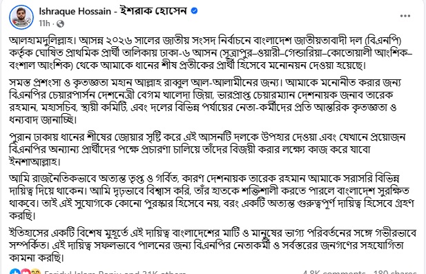 ইশরাক হোসেন লিখেছেন, আলহামদুলিল্লাহ। আসন্ন ২০২৬ সালের জাতীয় সংসদ নির্বাচনে বাংলাদেশ জাতীয়তাবাদী দল (বিএনপি) কর্তৃক ঘোষিত প্রাথমিক প্রার্থী তালিকায় ঢাকা-৬ আসন (সূত্রাপুর–ওয়ারী–গেন্ডারিয়া–কোতোয়ালি আংশিক–বংশাল আংশিক) থেকে আমাকে ধানের শীষ প্রতীকের প্রার্থী হিসেবে মনোনয়ন দেওয়া হয়েছে।