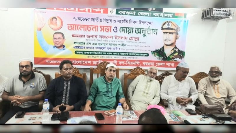 ৭ নভেম্বর জাতীয় বিপ্লব ও সংহতি দিবস উপলক্ষে সকালে বিএনপি কার্যালয়ে জাতীয় ও দলীয় পতাকা উত্তোলন করা হয় এবং শহীদ প্রেসিডেন্ট জিয়াউর রহমানের প্রতিকৃতিতে পুষ্পমাল্য অর্পণ করা হয়েছে। বরগুনা জেলা বিএনপির উদ্যোগে সন্ধ্যা ৭ টায় বিএনপি কার্যালয়ে এক আলোচনা সভা অনুষ্ঠিত হয়েছে। সভায় সভাপতিত্ব করেন বরগুনা জেলা বিএনপির আহবায়ক নজরুল ইসলাম মোল্লা বক্তব্য রাখেন জেলা বিএনপির সদস্য সচিব হুমায়ুন হাসান শাহিন জেলা যুবদলের সাধারণ সম্পাদক জাবেদুল ইসলাম জুয়েল জেলা ছাত্রদলের সভাপতি ফয়জুল মালেক সজিব। সভা পরিচালনা করেন বিএনপি নেতা হাবিবুর রহমান পান্না।