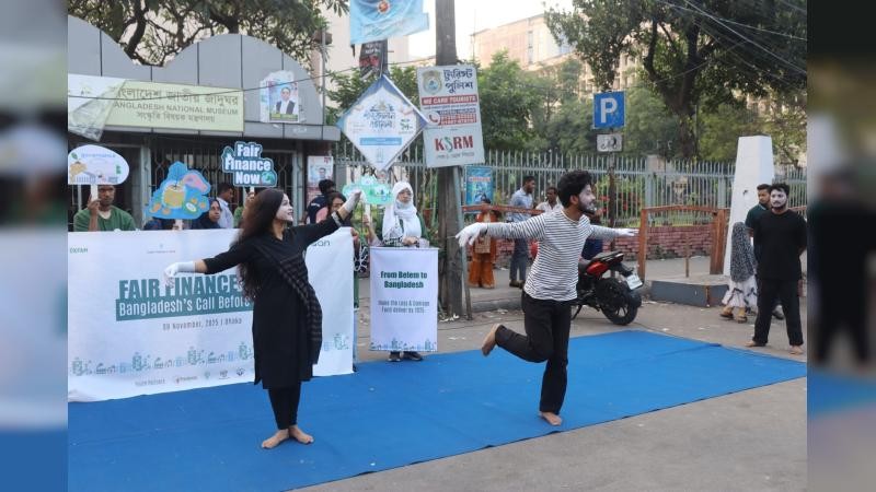 শনিবার (৮ নভেম্বর) রাজধানীর শাহবাগে জাতীয় জাদুঘরের সামনে যুবকদের নিয়ে "Fair Finance Now: Bangladesh's Call Before COP30" শীর্ষক এমন আয়োজন করা হয়।