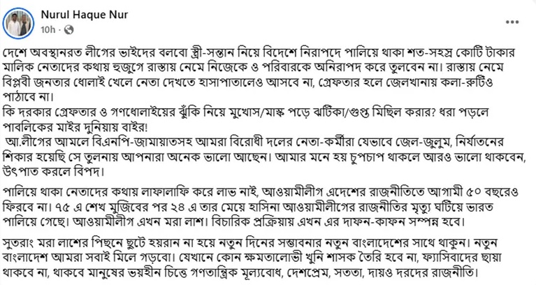নুর বলেন, স্ত্রী-সন্তান নিয়ে বিদেশে নিরাপদে পালিয়ে থাকা শত-সহস্র কোটি টাকার মালিক নেতাদের কথায় হুজুগে রাস্তায় নেমে নিজেকে ও পরিবারকে অনিরাপদ করে তুলবেন না। রাস্তায় নেমে বিপ্লবী জনতার ধোলাই খেলে নেতা দেখতে হাসাপাতালেও আসবে না, গ্রেফতার হলে জেলখানায় কলা-রুটিও পাঠাবে না।