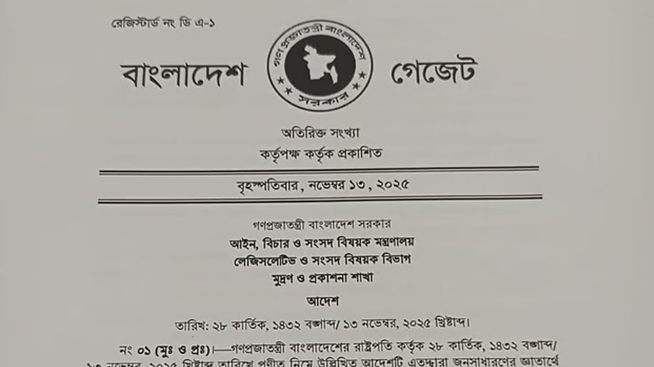 বৃহস্পতিবার (১৩ নভেম্বর) রাষ্ট্রপতি মো. সাহাবুদ্দিনের অনুমোদনের পর আইন, বিচার ও সংসদ বিষয়ক মন্ত্রণালয়ের লেজিসলেটিভ ও সংসদ বিষয়ক বিভাগ থেকে এই গেজেট প্রকাশ করা হয়।