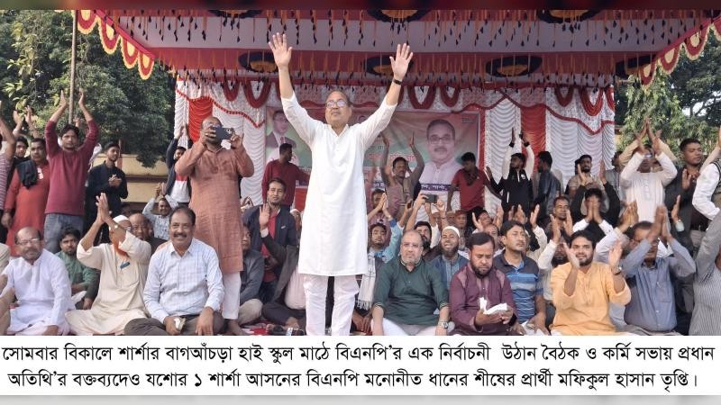 সোমবার বিকালে শার্শা উপজেলার বাগআঁচড়া মাধ্যমিক হাই স্কুল মাঠে বাগআঁচড়া ইউনিয়ন বিএনপি কতৃক আয়োজিত এক নির্বাচনী উঠান বৈঠক ও কর্মি সভা অনুষ্ঠিত হয় । এ অনুষ্ঠানে প্রধান অতিথি হিসেবে বক্তব্য রাখেন, যশোর ১ আসনের বিএনপি মনোনীত ধানের শীষের প্রার্থী মফিকুল হাসান তৃপ্তি। এ সময় তিনি উঠান বৈঠকে উপস্থিত পুরুষ ও নারী ভোটারদের মাঝে আগামীর রাষ্ট্র নায়ক তারেক রহমানের ৩১ দফা বাস্তবায়নের জন্য লিফলেট বিতরন করা হয়। বাগআঁচড়া ইউনিয়ন বিএনপির এ উঠান বৈঠক ও কর্মি সভায় হাজার হাজার নারী ও পুরুষ অংশ নিয়ে এক বিশাল জনসভায় পরিনত হয়।