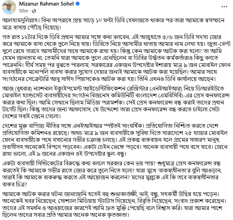 সোহেল বলেন, কেন তাকে আটক করা হলো তা তিনি বা কর্মকর্তারা জানতেন না। পরে জানা যায়, সরকারের একজন উপদেষ্টার ইশারায় মাত্র ৯ জন মোবাইল ফোন ব্যবসায়ীকে মনোপলি সুবিধা দেওয়ার জন্যই তাকে আটক করা হয়েছিল। তার সঙ্গে সংগঠনের সেক্রেটারি আবু সাঈদ পিয়াসকেও আটক করা হয়েছিল, যিনি এখনও ডিবি কার্যালয়ে রয়েছেন।