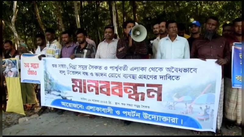 বরগুনার শুভ সন্ধ্যা সমুদ্র সৈকত ও নিদ্রা সৈকত এলাকা থেকে অবৈধ ভাবে বালু উত্তোলনের প্রতিবাদে এবং শুভ সন্ধ্যা সমুদ্র সৈকতে জিও ব্যাগ স্থাপনের দাবীতে মানববন্ধন করেছে এলাকাবাসী।