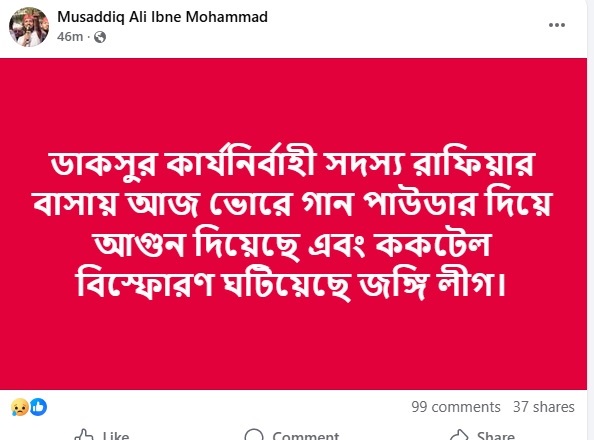 মুসাদ্দিক তার পোস্টে জানান, ডাকসুর কার্যনির্বাহী সদস্য রাফিয়ার বাসায় আজ ভোরে গান পাউডার দিয়ে আগুন দিয়েছে এবং ককটেল বিস্ফোরণ ঘটিয়েছে জঙ্গি লীগ।