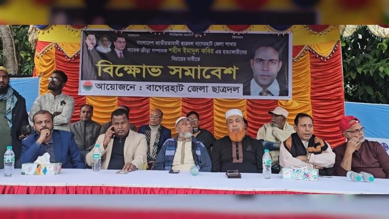 বাগেরহাট জেলা ছাত্রদলের সাবেক ক্রীড়া বিষয়ক সম্পাদক ইমাদুল কবির হত্যাকারীদের বিচারের দাবিতে খুব সমাবেশ অনুষ্ঠিত হয়েছে। শনিবার (২২ নভেম্বর) বিকেলে শহরের সোনাতলা মোড়ে জেলা ছাত্রদলের সাবেক সিনিয়র সহ-সভাপতি গোলাম রসুল তরফদার নেওয়াজের সভাপতিত্বে অনুষ্ঠিত বিক্ষোভ সমাবেশে প্রধান অতিথি হিসেবে উপস্থিত ছিলেন বাগেরহাট জেলা বিএনপির আহবায়ক ইঞ্জিনিয়ার এটিএম আকরাম হোসেন তালিম।