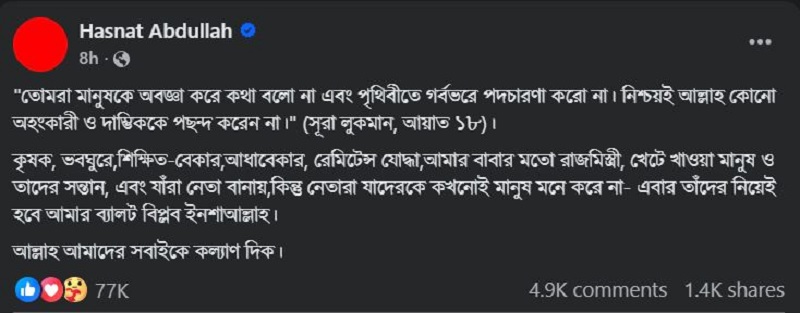 তিনি আরও লিখেছেন, কৃষক, ভবঘুরে, শিক্ষিত-বেকার, আধাবেকার, রেমিটেন্স যোদ্ধা, আমার বাবার মতো রাজমিস্ত্রী, খেটে খাওয়া মানুষ ও তাদের সন্তান, এবং যারা নেতা বানায় কিন্তু নেতারা যাদেরকে কখনই মানুষ মনে করে না- এবার তাদের নিয়েই হবে আমার ব্যালট বিপ্লব ইনশাআল্লাহ।