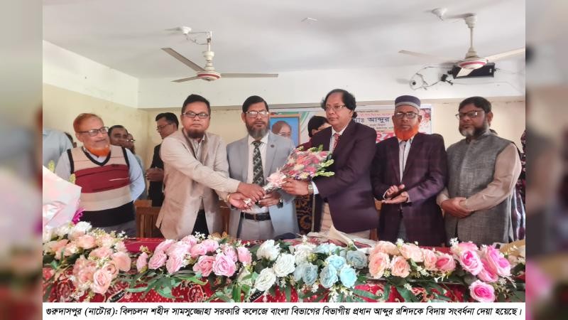 গুরুদাসপুরের বিলচলন শহীদ সামসুজ্জোহা সরকারি কলেজের বাংলা বিভাগের বিভাগীয় প্রধান আব্দুর রশিদের অবসর গ্রহণ উপলক্ষে মানপত্র দান, সম্মাননা ক্রেস্টসহ ফুল দিয়ে ভালোবাসা ও সম্মান জানানো হয়েছে। সোমবার অত্র কলেজে বাংলা বিভাগের আয়োজনে তাঁকে বিদায় সংবর্ধনা দেয়া হয়।