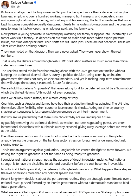 বাংলাদেশের এলডিসি (স্বল্পোন্নত দেশ) থেকে উত্তরণের সময়সূচি ও চট্টগ্রাম বন্দরের দীর্ঘমেয়াদি সিদ্ধান্ত নিয়ে উদ্বেগ প্রকাশ করেছেন বিএনপির ভারপ্রাপ্ত চেয়ারম্যান তারেক রহমান। ফেসবুকে প্রকাশিত এক দীর্ঘ পোস্টে তিনি দাবি করেন, এই দুটি জাতীয় কৌশলগত সিদ্ধান্ত এমন একটি অন্তর্বর্তীকালীন সরকারের হাতে রয়েছে, যার জনগণের কাছ থেকে কোনো নির্বাচনী ম্যান্ডেট নেই।