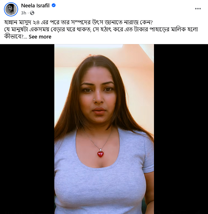 তিনি আরও জানান, হান্নান মাসউদ নিজেকে একজন শিক্ষক হিসেবে পরিচয় দেন এবং দাবি করেন যে তিনি মাসে ৭০–৮০ হাজার টাকা আয় করেন। কিন্তু তার জীবনযাপন ও প্রকাশিত সম্পদের সঙ্গে এই আয় সামঞ্জস্যপূর্ণ কি না—সেই প্রশ্ন থেকেই যায়। নীলা ইসরাফিল মনে করেন, ঠিক এই প্রশ্নের মুখোমুখি হয়েই তিনি অস্বস্তিকর ও অসংলগ্ন ইংরেজি বাক্য ব্যবহার করেছেন।