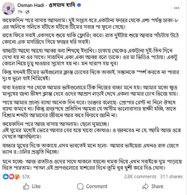 বিডি২৪লাইভ-এর পাঠকদের জন্য ওসমান হাদির পুরো ফেসবুক স্ট্যাটাসটি হুবহু তুলে ধরা হলো:--