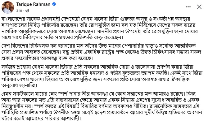 আজ শনিবার সকাল ৯টার একটু আগে যোগাযোগমাধ্যম ফেসবুকে বেগম খালেদা জিয়ার বড় ছেলে ও বিএনপির ভারপ্রাপ্ত চেয়ারম্যান তারেক রহমান একটি আবেগঘন বিবৃতি প্রকাশ করেন। তিনি লিখেছেন, তার মায়ের জন্য দেশ-বিদেশে লাখো মানুষের দোয়া ও ভালোবাসা জিয়া পরিবারকে গভীরভাবে অনুপ্রাণিত করছে।