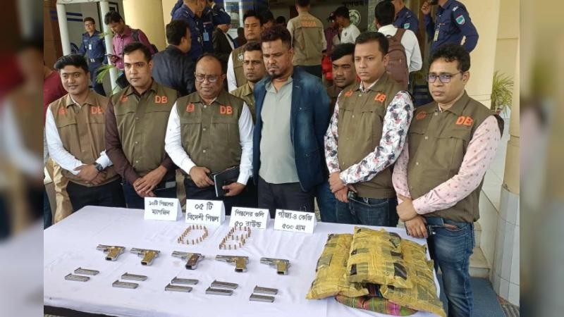 উদ্ধারকৃত অস্ত্রের মধ্যে রয়েছে ৫টি ৭.৬৫ মিমি বিদেশি পিস্তল, ১০টি ম্যাগাজিন, ৫০ রাউন্ড গুলি এবং ৪ কেজি ৫০০ গ্রাম গাঁজা।