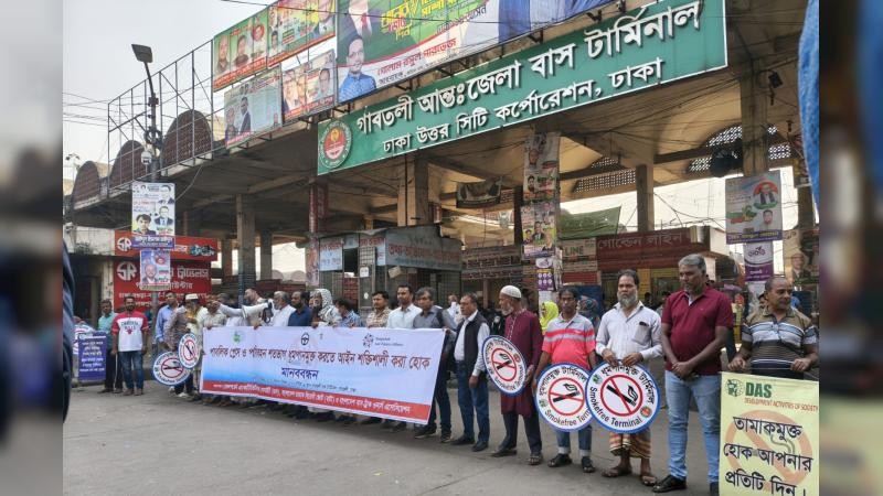 অদ্য রবিবার, ৩০ নভেম্বর ২০২৫ সকালে অনুষ্ঠিত "পাবলিক প্লেস ও পরিবহন শতভাগ ধূমপানমুক্ত করতে আইন শক্তিশালী করা হোক"- শীর্ষক মানববন্ধন ও আলোচনা সভায় বক্তারা এসব কথা বলেন। ডেভলপমেন্ট অ্যাকটিভিটিস অফ সোসাইটি (ডাস), বাংলাদেশ তামাক বিরোধী জোট (বাটা) ও বাংলাদেশ বাস-ট্রাক ওনার্স অ্যাসোসিয়েশন, গাবতলীর সমন্বিত উদ্যোগে কর্মসূচি দুটি যথাক্রমে গাবতলী বাস টার্মিনালের সম্মুখে এবং মালিক সমিতির হল রুমে অনুষ্ঠিত হয়।