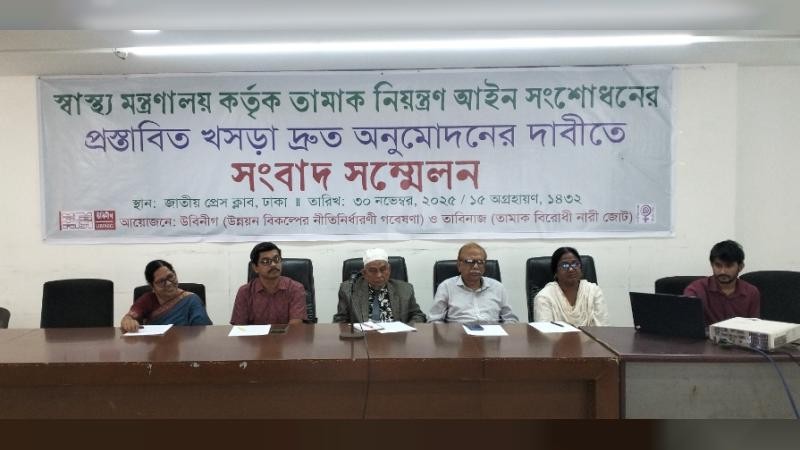স্বাস্থ্য মন্ত্রণালয় কর্তৃক প্রস্তাবিত তামাক নিয়ন্ত্রণ আইন সংশোধনের খসড়াটি দ্রুত অনুমোদনের জোর দাবি জানিয়েছে উবিনীগ (উন্নয়ন বিকল্পের নীতি নির্ধারণী গবেষণা) ও তাবিনাজ (তামাক বিরোধী নারী জোট)। এই লক্ষ্যে উবিনীগ ও তাবিনাজ গতকাল জাতীয় প্রেস ক্লাবের আব্দুস সালাম কনফারেন্স হলে একটি সংবাদ সম্মেলনের আয়োজন করে।
