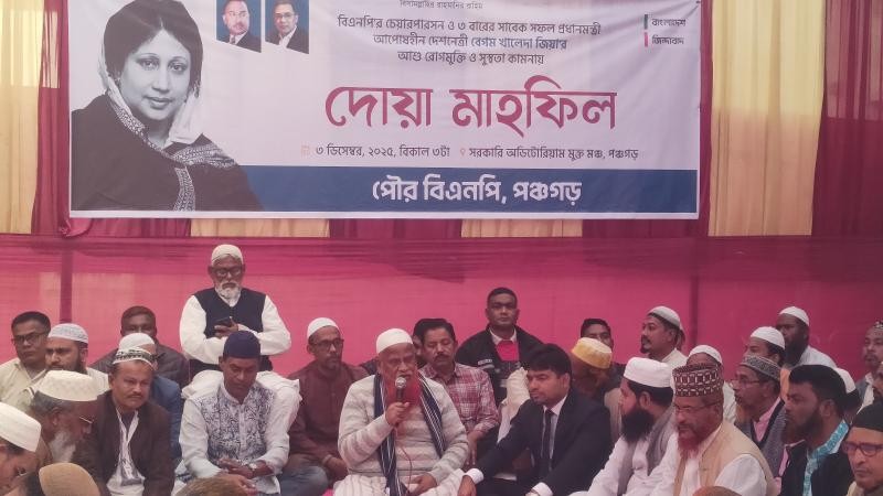 পঞ্চগড়ে মাদ্রাসার এতিম ছাত্রদের নিয়ে সাবেক প্রধানমন্ত্রী ও বিএনপি চেয়ারপার্সন খালেদা জিয়ার রোগমুক্তি কামনায় দোয়া মাহফিল অনুষ্ঠিত হয়েছে। বুধবার (৩ ডিসেম্বর) বিকেলে পঞ্চগড় পৌর বিএনপির আহ্বায়ক ও সাবেক মেয়র তৌহিদুল ইসলামের আয়োজনে পঞ্চগড় সরকারি অডিটোরিয়াম চত্বরে হাজারো নেতাকর্মী নিয়ে এই দোয়া মাহফিল কর্মসূচি পালিত হয়।