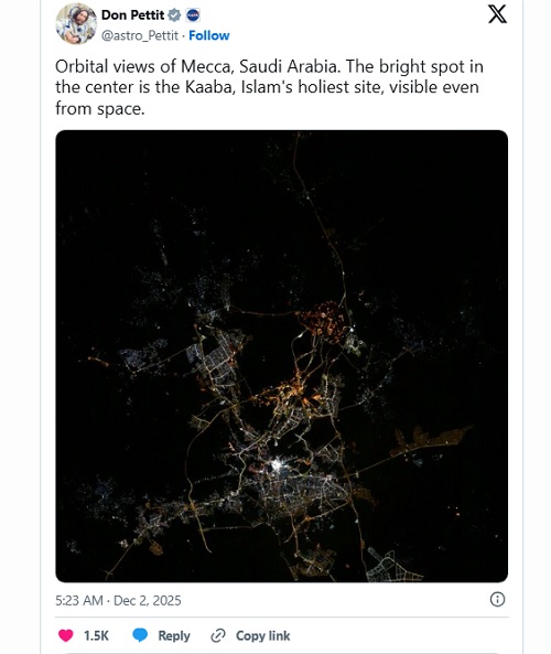 দক্ষ ‘অ্যাস্ট্রো ফটোগ্রাফার’ও রসায়ন প্রকৌশলী ডন পেটিট গত ২ ডিসেম্বর তাঁর এক্স অ্যাকাউন্টে ছবিটি পোস্ট করেন। ক্যাপশনে তিনি লেখেন, মহাকাশের কক্ষপথ (অরবিট) থেকে তোলা সৌদি আরবের মক্কা। মাঝখানের উজ্জ্বল ছোট্ট এলাকাটি কাবা শরিফ, ইসলাম ধর্মের সবচেয়ে পবিত্র স্থান, যা মহাকাশ থেকেও দৃশ্যমান।