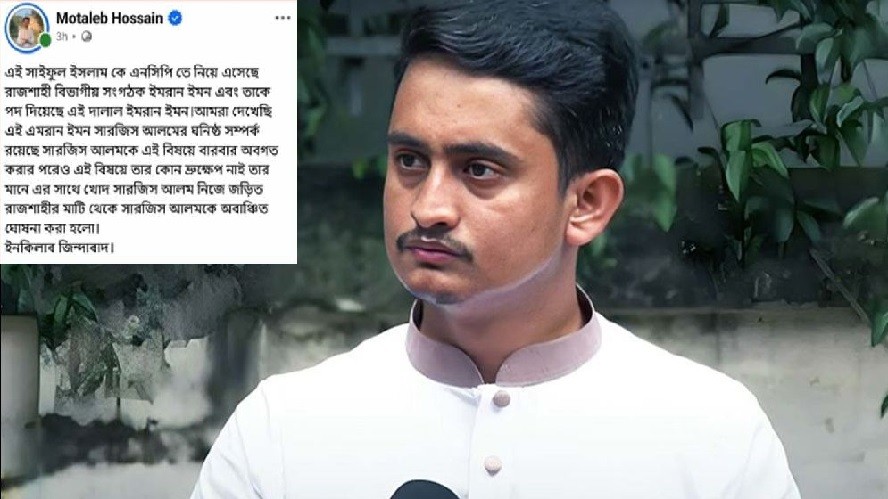 মোতালেবের দাবি, সাইফুল ইসলামকে এনসিপিতে এনেছেন বিভাগীয় সংগঠক ইমরান ইমন, আর সারজিস আলমের সঙ্গে তার ঘনিষ্ঠ সম্পর্ক থাকায় অভিযোগের পরও কোনো ব্যবস্থা নেওয়া হয়নি। তিনি লিখেছেন, “এর মানে তিনিও জড়িত।”