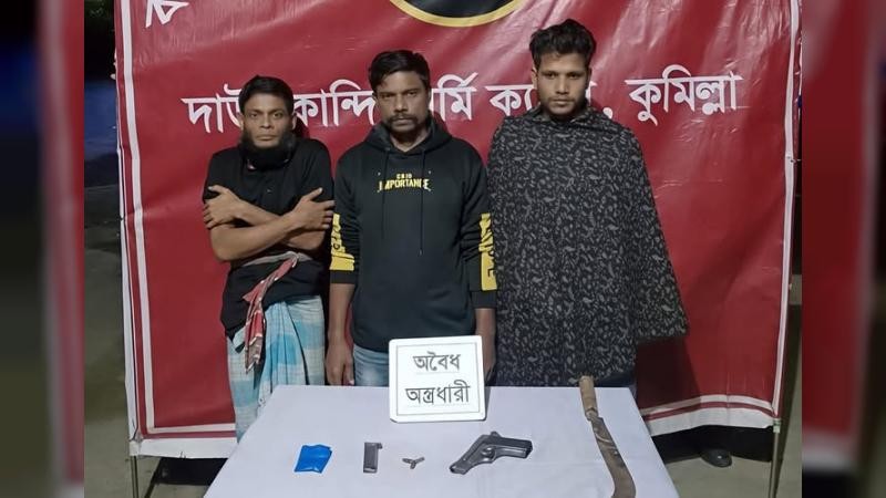 কুমিল্লা অবৈধ পিস্তল ও গুলিসহ ৩ অস্ত্র ব্যবসায়ী গ্রেফতার করেছে যৌথবাহিনী। এসময় একটি পিস্তল, তিন রাউন্ড গুলি, একটি রামদা এবং ইয়াবা তৈরির সরঞ্জামাদি উদ্ধার করা হয়। রোববার ভোরে জেলার তিতাস উপজেলার শাহাপুর এলাকায় অবৈধ অস্ত্র উদ্ধার করা হয়। বিষয়টি নিশ্চিত করেন তিতাস থানার ভারপ্রাপ্ত কর্মকর্তা (তদন্ত) মো. মফিজ উদ্দিন।