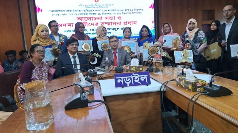 “নারী ও কন্যার প্রতি সহিংসতা বন্ধে ঐক্যবদ্ধ হই, ডিজিটাল নিরাপত্তা নিশ্চিত করি” এ প্রতিপাদ্যকে সামনে রেখে নড়াইলে আন্তর্জাতিক নারী নির্যাতন প্রতিরোধ পক্ষ এবং বেগম রোকেয়া দিবস উপলক্ষে র্যালী, আলোচনা সভা ও অদম্য নারীদের সম্মাননা প্রদান অনুষ্ঠিত হয়েছে।