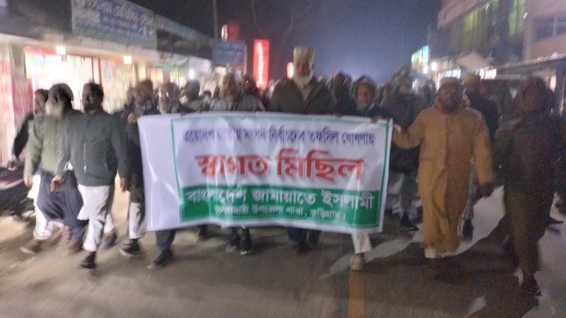 কুড়িগ্রামের ভূরুঙ্গামারীতে ত্রয়োদশ জাতীয় সংসদ নির্বাচনের তফসিল ঘোষণাকে স্বাগত জানিয়ে আনন্দ মিছিল করেছে উপজেলা জামায়াতে ইসলামী। বৃহস্পতিবার (১১ ডিসেম্বর) রাত সাড়ে আটটায় উপজেলা জামায়াতের কার্যালয় থেকে এই আনন্দ মিছিল বের করা হয়।
