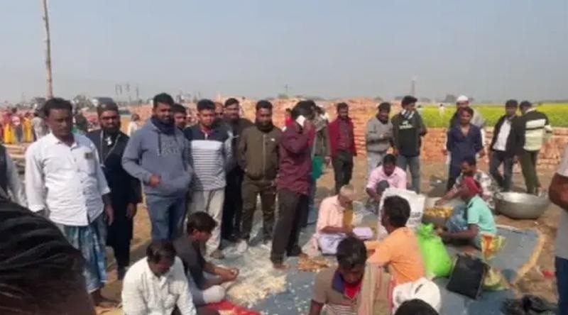 নামাজ শেষে ভোজের আয়োজন নামাজ শেষে প্রায় এক হাজার মানুষের বিনামূল্যে খাবারের ব্যবস্থাও করা হয়েছে। রান্নার দায়িত্বে থাকা দলের একজন সদস্য জানান, তারা দেড় কুইন্টাল চালসহ অন্যান্য সামগ্রী এনেছেন এবং এই সেবার মাধ্যমে পুণ্য (সওয়াব) অর্জিত হবে। মসজিদ নির্মাণের জন্য সাধারণ মানুষের দান করা ইটের স্তূপও দেখা গেছে নামাজস্থলের পেছনে।
