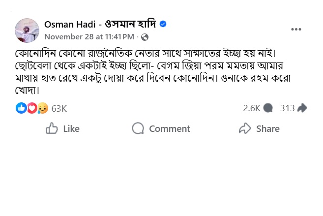 গত ২৮ নভেম্বর অসুস্থ বেগম খালেদা জিয়াকে নিয়ে নিজের ইচ্ছার কথা জানিয়ে একটি স্ট্যাটাস দেন ওসমান হাদি। সেখানে তিনি লেখেন, কোনোদিন কোনো রাজনৈতিক নেতার সাথে সাক্ষাতের ইচ্ছা হয় নাই। ছোটবেলা থেকে একটাই ইচ্ছা ছিলো- বেগম জিয়া পরম মমতায় আমার মাথায় হাত রেখে একটু দোয়া করে দিবেন কোনোদিন। ওনাকে রহম করো খোদা।