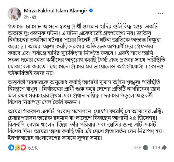 মির্জা ফখরুল লিখেছেন, গতকাল ঢাকা-৮ আসনে স্বতন্ত্র প্রার্থী ওসমান হাদির গুলিবিদ্ধ হওয়া একটি অত্যন্ত দুঃখজনক ঘটনা। এ ঘটনা একেবারেই গ্রহণযোগ্য নয়। জাতীয় নির্বাচনের তফসিল ঘটনার পরের দিনেই এই ঘটনা জাতিকে অত্যন্ত বিক্ষুব্ধ করেছে।
