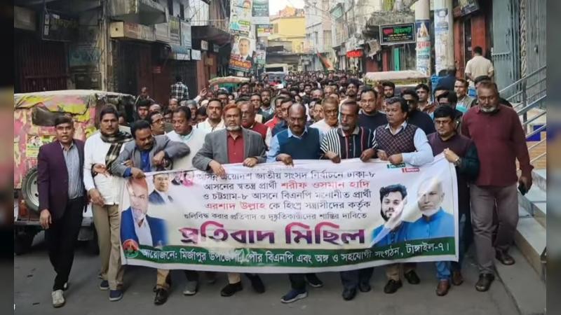 ঢাকা ৮ আসনের সংসদ সদস্য প্রার্থী, ইনকিলাব মঞ্চের মুখপত্র শরিফ ওসমান হাদি এবং চট্টগ্রাম ৮ আসনের বিএনপি মনোনীত সংদস্য প্রার্থী এরশাদ উল্লাহর ওপর সন্ত্রাসী হামলার প্রতিবাদে মিছিল করেছে টাঙ্গাইলের মির্জাপুর উপজেলা বিএনপি।