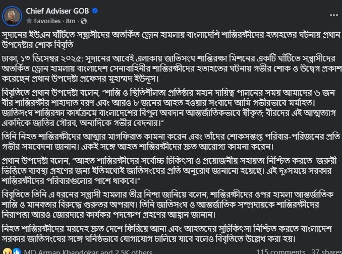 প্রধান উপদেষ্টা নিহত শান্তিরক্ষীদের আত্মার মাগফিরাত কামনা করেন এবং তাদের শোকসন্তপ্ত পরিবার-পরিজনের প্রতি গভীর সমবেদনা জানান। একই সঙ্গে আহত শান্তিরক্ষীদের দ্রুত আরোগ্য কামনা করেন।
