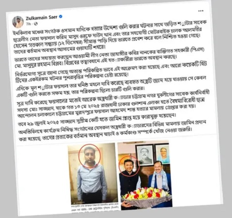 রোববার (১৪ ডিসেম্বর) সকালে নিজের ভেরিফায়েড ফেসবুক আইডিতে দেওয়া এক পোস্টে তিনি এ দাবি করেন। পোস্টে সায়ের জানান, তারা ১২ ডিসেম্বর সন্ধ্যায় সীমান্ত পাড়ি দিয়ে ভারতে প্রবেশ করেছেন বলে নিশ্চিত হওয়া গেছে। বর্তমানে তারা আসামের গুয়াহাটি শহরে অবস্থান করছেন।