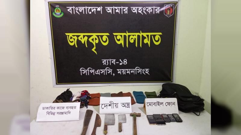 ময়মনসিংহ জেলার কোতোয়ালী থানাধীন দাপুনিয়া বাজার এলাকায় র্যাব-১৪ অভিযান চালিয়ে আন্তঃজেলা ডাকাত চক্রের ৬ জন সক্রিয় সদস্যকে গ্রেপ্তার করেছে।