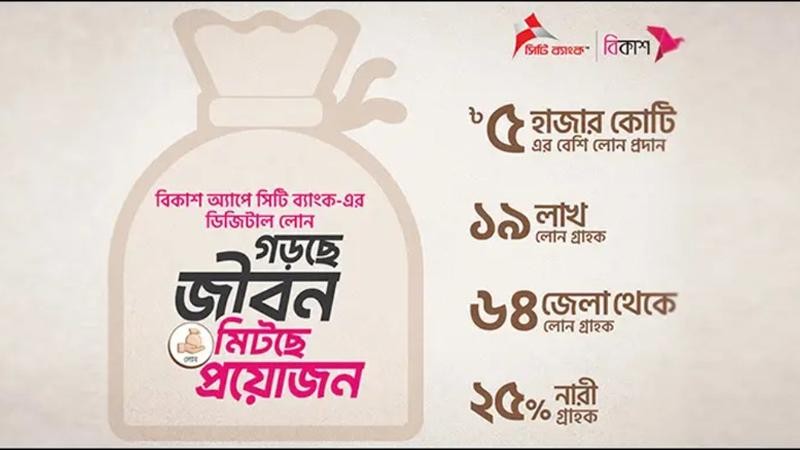 বিকাশ অ্যাপের মাধ্যমে সিটি ব্যাংক থেকে এ পর্যন্ত ৫ হাজার কোটি টাকার বেশি জামানতবিহীন ডিজিটাল লোন বিতরণ করা হয়েছে। চালু হওয়ার মাত্র তিন বছরের মধ্যেই এই মাইলফলক অর্জিত হয়েছে। এ সময়ের মধ্যে ১ কোটি ২৭ লাখ বারেরও বেশি এই ছোট অঙ্কের লোন গ্রহণ করেছেন ১৯ লাখের বেশি গ্রাহক।
