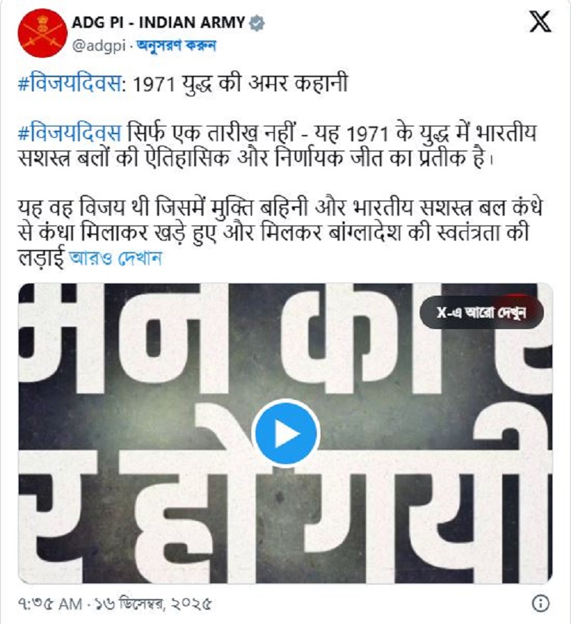 মঙ্গলবার (১৬ ডিসেম্বর) এ উপলক্ষে সামাজিক মাধ্যম এক্স-এ একটি বিবৃতি দিয়েছে ভারতীয় সেনাবাহিনী। এতে বলা হয়েছে, বিজয় দিবস কেবল একটি তারিখ নয় - এটি ১৯৭১ সালের যুদ্ধে ভারতীয় সশস্ত্র বাহিনীর ঐতিহাসিক এবং চূড়ান্ত বিজয়ের প্রতীক।