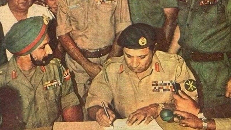 ১৯৭১ সালের ১৬ ডিসেম্বর আত্মসমর্পণের দলিলে সই করেন পাকিস্তানি বাহিনীর পূর্বাঞ্চলীয় কমান্ডের অধিনায়ক লে. জেনারেল এ এ কে নিয়াজি (ডানে)। তার পাশে মিত্রবাহিনীর লে. জেনারেল জগজিৎ সিং অরোরা।